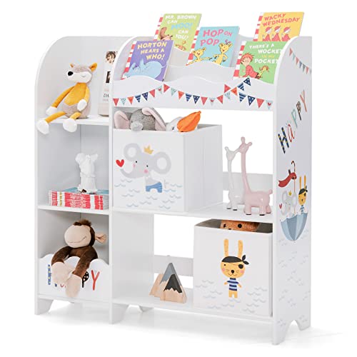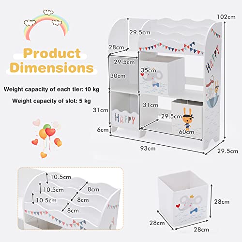 HOMASIS Scaffale per Bambini a 3 Livelli, Libreria per Bambini, Portagiochi e Portariviste, Organizzatore per Giocattoli con 5 Scomparti e 2 Contenitori, 93 x 30 x 102cm, Bianco (modello 1)