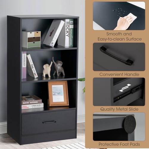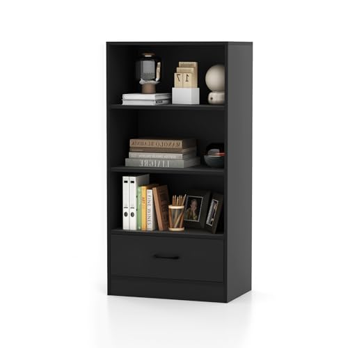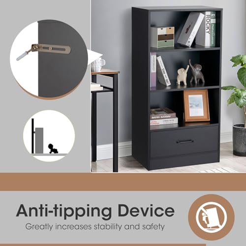 HOMASIS Scaffale verticale con cassetto di stoccaggio, libreria in legno a 4 livelli, scaffale in piedi con dispositivo antiribaltamento, capacità di carico totale 90 kg, 60 x 38 x 120 cm (nero)
