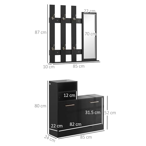 HOMCOM Set Appendi Abiti da Ingresso con Specchio e Scarpiera per 8 Paia di Scarpe, Legno Nero Lucido