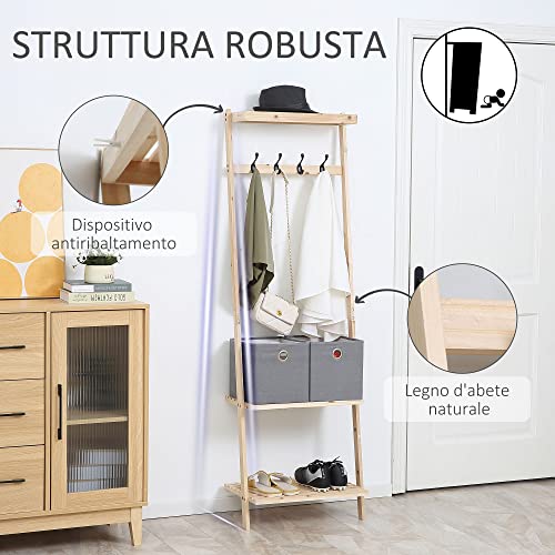 HOMCOM Appendiabiti Multifunzione con 4 Ganci Attaccapanni, 3 Mensole e 2 Cestini in Tessuto, per Ingresso e Camera da Letto, in Legno Naturale