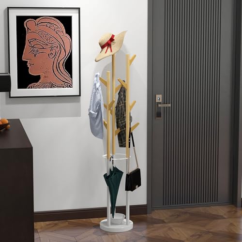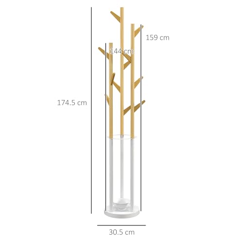HOMCOM Appendiabiti da Terra di Design con Portaombrelli e 12 Ganci, Metallo e Bambù, 30.5x30.5x174.5cm, Legno e Bianco