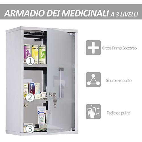 HOMCOM Armadietto medicinali 50x30x18cm Cassetta mobile bagno primo soccorso in acciaio inox con serratura