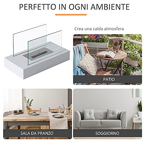 HOMCOM Camino a Bioetanolo da Tavolo Ecologico 2000W Bruciatori senza Residui Inodore In Acciaio Inox con Vetro 35×18×21cm Bianco