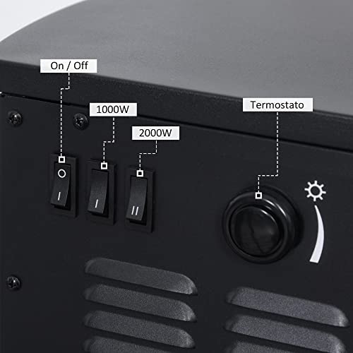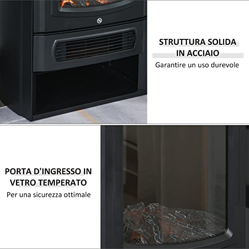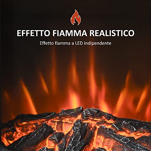 HOMCOM Camino Elettrico con Fiamma Realistica e Temperatura Regolabile, Riscalda 20-25㎡, Acciaio Nero e Vetro Temperato