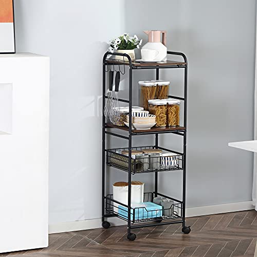 HOMCOM Carrello da Cucina con 2 Cesti Estraibili in Metallo, 2 Ripiani in Legno Truciolato e Ganci Laterali, 40x38x111cm