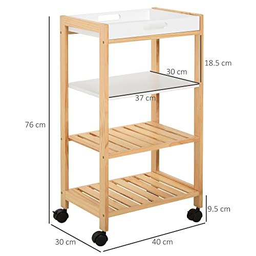 HOMCOM Carrello da Cucina a 4 Livelli in MDF e Legno di Pino con 4 Ruote Girevoli, 40x30x76 cm, Bianco e Marrone