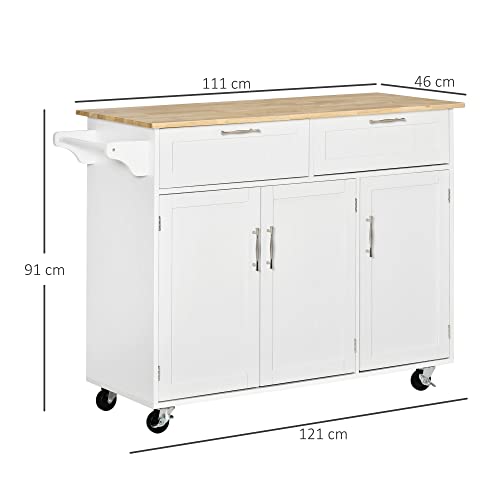 HOMCOM Carrello da Cucina Multiuso con 2 Cassetti, 3 Antine e 4 Ruote, in Legno e MDF, 121x46x91cm, Bianco