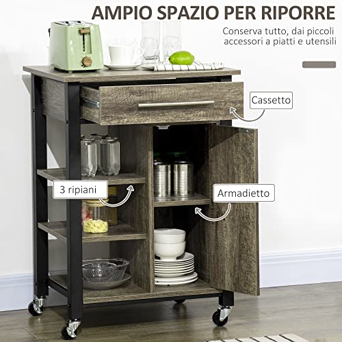 Homcom Carrello da Cucina Portavivande con Cassetto, Mensole, Armadietto e 4 Ruote, Legno Truciolare, 60x50x84.5cm, Quercia