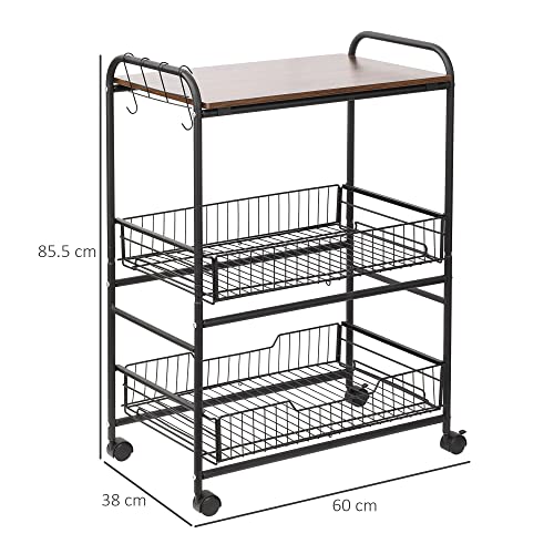 Homcom Carrello da Cucina Portavivande Stile Industriale con 4 Ruote, 2 Cestini e 4 Ganci, 60x38x85.5cm, Marrone Nero