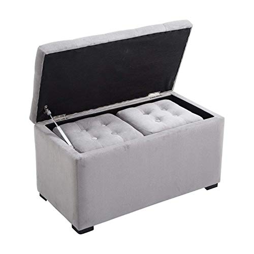Homcom Cassapanca Portaoggetti Set di 3 Pezzi con 2 Sgabelli Pouf in Velluto, Grigio Perla