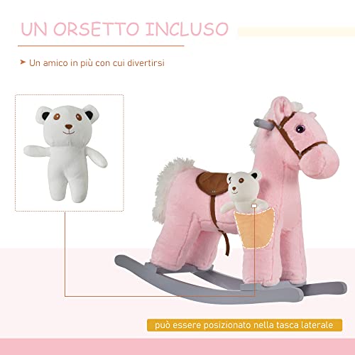 HOMCOM Cavallo a Dondolo in Legno e Peluche con Suoni e Orsetto Incluso, per Bimbi da 18-36 Mesi, 65x26x55cm, Rosa