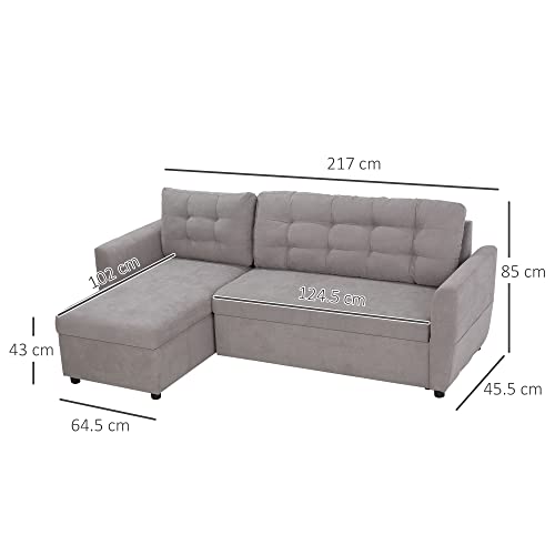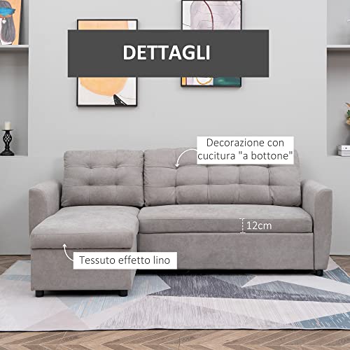 Homcom Divano Letto Angolare 3 Posti con Chaise Longue Contenitore e Rivestimento Effetto Lino, 217x134x85cm, Grigio