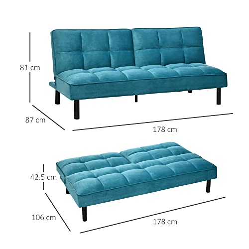 HOMCOM Divano Letto Reclinabile con Seduta Imbottita, Divano 3 Posti per Soggiorno e Camera da Letto in Velluto Verde, Legno e Acciaio