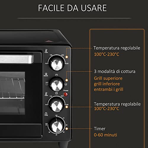 HOMCOM Fornetto Elettrico 32L Regolazione Temperatura e Timer, 3 Modalità di Cottura e Accessori, 1600W, 52.2x38.1x33.5cm, Nero