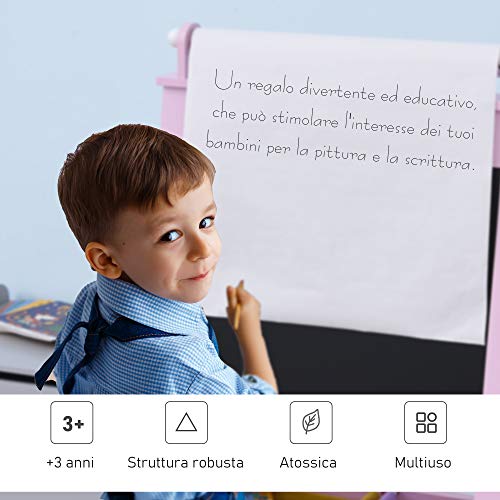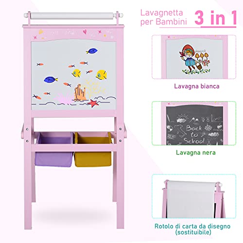 HOMCOM Lavagnetta per Bambini in Legno Rosa con Cavalletto 3 in 1: Lavagna Bianca, Nera e con Rullo Fogli di Carta