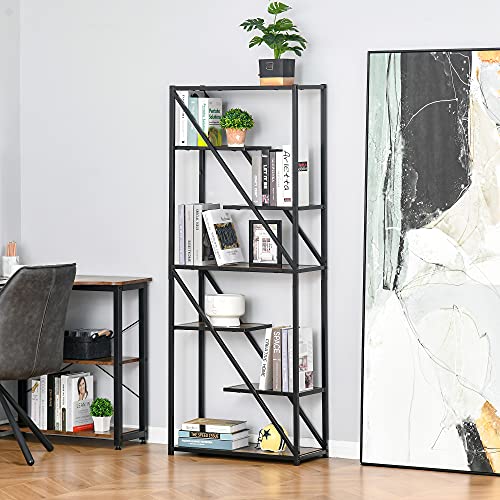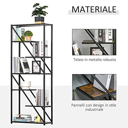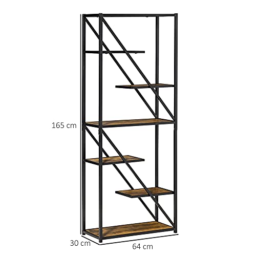 HOMCOM Libreria Moderna a Muro Stile Industriale, Scaffale con Design Asimmetrico a 6 Ripiani, 64x30x165cm, Marrone e Nero