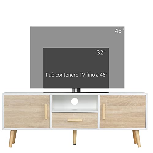 HOMCOM Mobile TV Basso per TV Fino a 46" con Ripiano Aperto, Un Cassetto e 2 Armadietti, Mobiletto TV in Truciolato e Legno di Pino, 120x37x45.5cm, Bianco e Color Legno