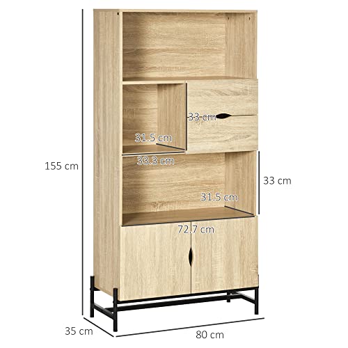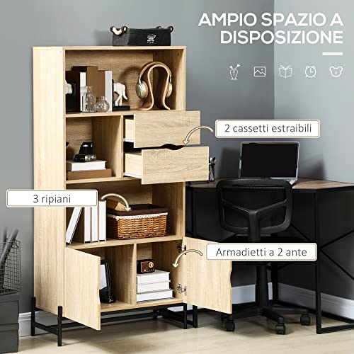 HOMCOM Mobile Libreria a Parete in MDF e Metallo con 2 Cassetti, 2 Armadietti e 4 Ripiani Aperti, 80x35x155 cm, color Legno