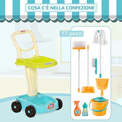 Homcom Set Pulizie Giocattolo per Bambini 3-6 Anni con Carrello, Scopa, Secchio e Mocio, 17 Accessori, 30x29x55cm
