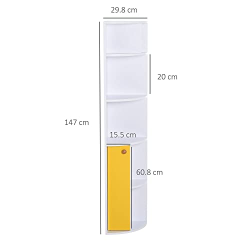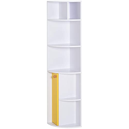 Homcom Scaffale Angolare da Parete in Legno Bianco, Mobile Libreria con 5 Ripiani e Armadietto Giallo, Design Moderno, 29.8x29.9x147cm