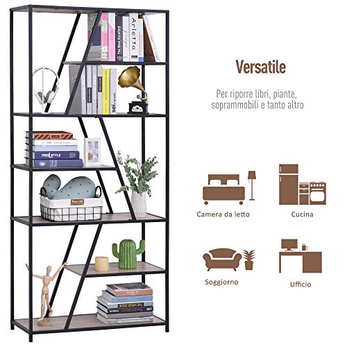 Homcom Scaffale Libreria da Parete in Stile Industriale con 9 Ripiani Asimmetrici in Legno e Metallo Nero 80x33x180cm