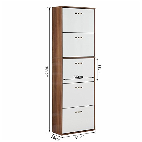 HOMCOM Scarpiera Slim Salvaspazio a 5 Livelli per 30 Paia max con 2 Ripiani per Livello, Mobile Portascarpe in MDF, 60x28x189 cm, Bianco e Marrone