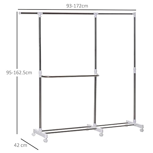 Homcom Stender Estensibile Appendiabiti Stendibiancheria 3 Livelli con Portascarpe e Ruote, Acciaio e PP, Bianco, 93-172x42x95-162.5cm