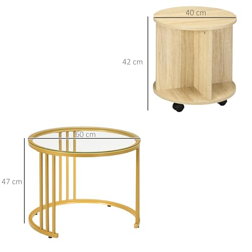 HOMCOM Set 2 Tavolini da Salotto Rotondi con Design Impilabile, 4 Ripiani Inferiori e 4 Ruote, Ø60x47 cm e Ø40x42 cm, Color Oro e Rovere