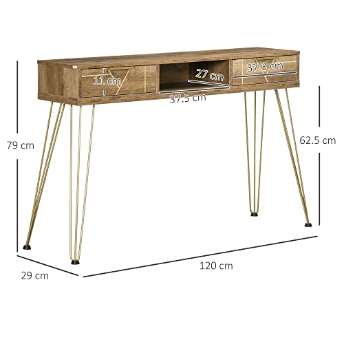 HOMCOM Tavolo Consolle in Truciolato e Acciaio per Ingresso e Soggiorno con Piano d'Appoggio, Ripiano Aperto e 2 Cassetti, 120x29x79 cm, Bronzo