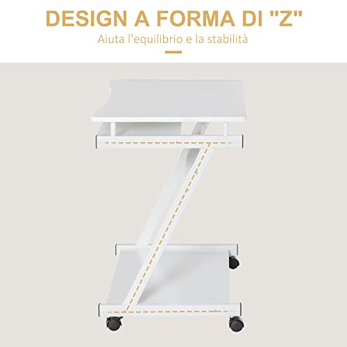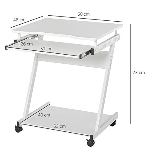 HOMCOM Tavolo Porta PC Classico e Salvaspazio, Piano Tastiera a Scomparsa, 4 Ruote e Ripiano Inferiore Bianco 60x48x73cm