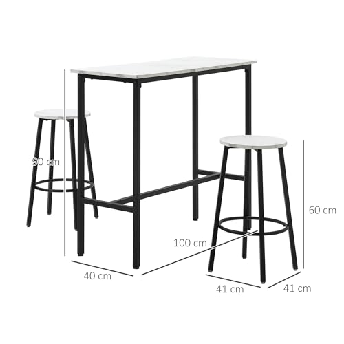 HOMCOM Set Tavolo e Sedie 3 Pezzi in Truciolato, MDF e Acciaio con Tavolo Rettangolare e 2 Sgabelli da Bar per Soggiorno e Sala da Pranzo, Bianco e Nero