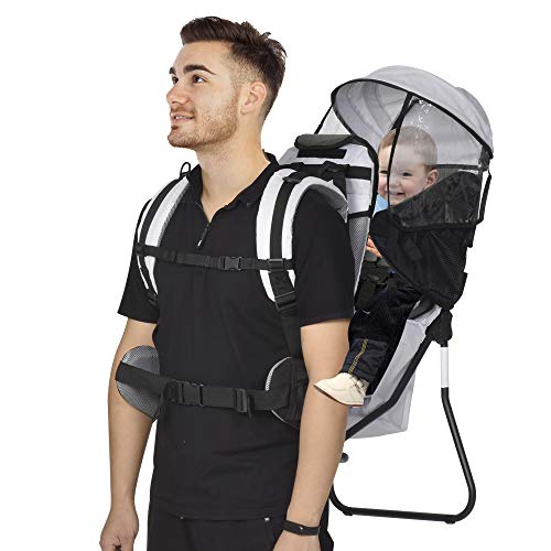 COMODO E SICURO: Questo zaino porta bimbo è progettato per tenere il tuo piccolino sempre al sicuro, ma senza rinunciare al comfort. La seduta ha una comoda imbottitura in gommapiuma ed è rivestita con un tessuto felpato. Ha una cintura di sicurezza a 5 punti e un tettuccio rimovibile e impermeabile.