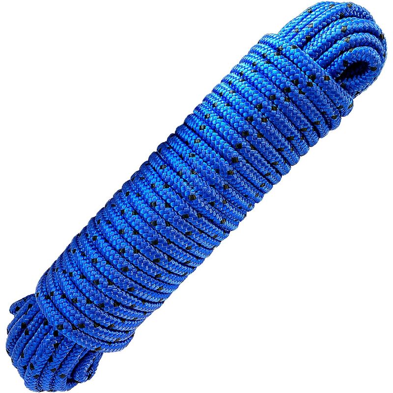 Lunghezza: 20 m, diametro/spessore: 8 mm, intrecciato a 16 vie Colore: Blu con filo nero, colori a lunga tenuta Carico di rottura: 700 Kg, ottimo carico di rottura - Impiego multifunzionale, ad esempio per il sollevamento e la movimentazione Ambiti di impiego: giardino, outdoor, canottaggio, tempo libero, per il fissaggio di teloni e molto altro Il Materiale: 100% polipropilene con anima in filamento di polipropilene. L'anima della corda crea la sua alta qualità.