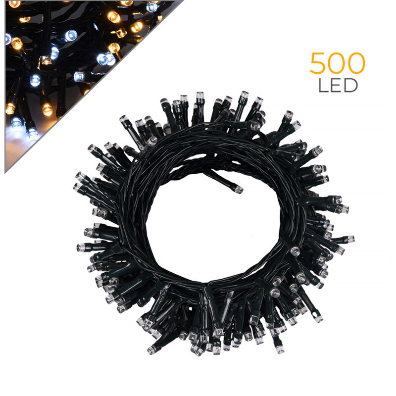Luccika Home. Stringa a led colore Bianco Ghiaccio e Bianco Caldo con filo verde e trasformatore a bassa tensione applicabile all'interno e all'esterno. Adatta come decorazione luminosa di Natale ma anche per feste ed eventi come matrimoni. Facile da montare in casa su arredi e alberi di Natale, in negozio su vetrine e allestimenti espositivi pubblicitari Perfetta anche per addobbare giardini, gazebi e spazi all'aperto grazie al suo grado di protezione IP44. Munita di controller con 8 giochi di luce comprensivi di luce fissa e Memoria. CARATTERISTICHE: - Colore della luce: Bianco Ghiaccio e Bianco Caldo. - Numero luci: 500. - Lunghezza: 25 mt + 3 mt cavo spina. - Cavo: Verde in pvc da 2 mm. - Grado di protezione: IP44. - Installazione: Interno ed Esterno. - Prolungabile: No. - Diametro led: 5 mm. - Distanza tra i led: 5 cm. - Controller: con spina schuko integrata e Memoria (la stringa si riaccendera' con lo stesso gioco di luci impostato allo spegnimento, ottimo per chi utilizza