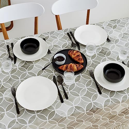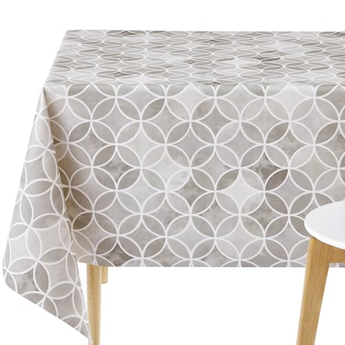 Tovaglia di alta qualità KP HOME in grigio con moderno motivo Geo. Questa elegante stampa geometrica aggiungerà un tocco contemporaneo alla tua casa, ristorante o bar. La tovaglia in plastica riutilizzabile in pelle cerata nelle tonalità di grigio base è ideale per l'uso quotidiano e per qualsiasi occasione speciale. Questa tovaglia in PVC dal design a cerchi è facile da pulire e ha una finitura unica al tatto.