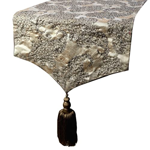 The HomeCentric Decorativo Argento oro Runner da tavola, 35 x 90 cm Seta Jacquard Runner da tavola, Paisley, perline e lamina con nappe, Paisley Biancheria da tavola, Contemporaneo - Paisley Luxury