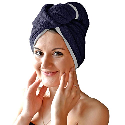 2 IN 1: kit da 2 asciugamani per capelli a turbante / 100% cotone / blu scuro / bordo grigio chiaro. Delicato sulla pelle, ogni asciugamano si adatta alla forma della testa ed è dotato di un comodo bottone per fissare la chiusura.