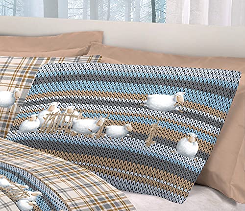 HomeLife Set Lenzuola Una Piazza e Mezza Flanella, Made in Italy - Lenzuolo Sopra, Lenzuolo Sotto con Angoli e Federa - Completo Lenzuola 1 Piazza e Mezza Flanella (Fantasia Pecorelle, Beige)