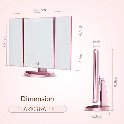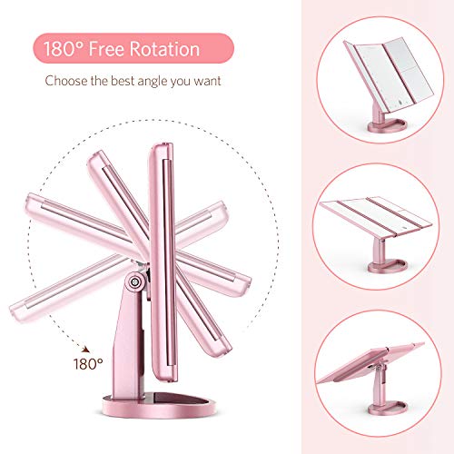 HOMEVER Specchio Trucco con 21 LEDs, Specchio di Vanity Trifold Ruota di 180° Ingrandimento 1x / 2X / 3X Specchio per Il con Touchscreen per Il Trucco e la Cura della Pelle (Rosa)