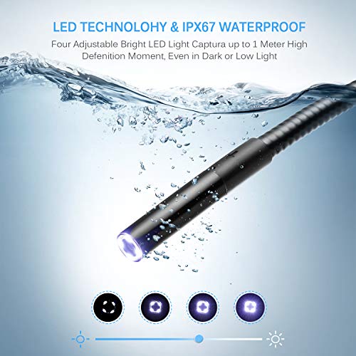 Flessibile, impermeabile e LED: Impermeabilità IP67 con 8 mm di diametro della testa, che permette di osservare in zone di acqua. 4 LED Integrate regolabili, inoltre supporta quattro prospettive di conversione, facile a controllare le aree in ambienti scuri o bassa luce