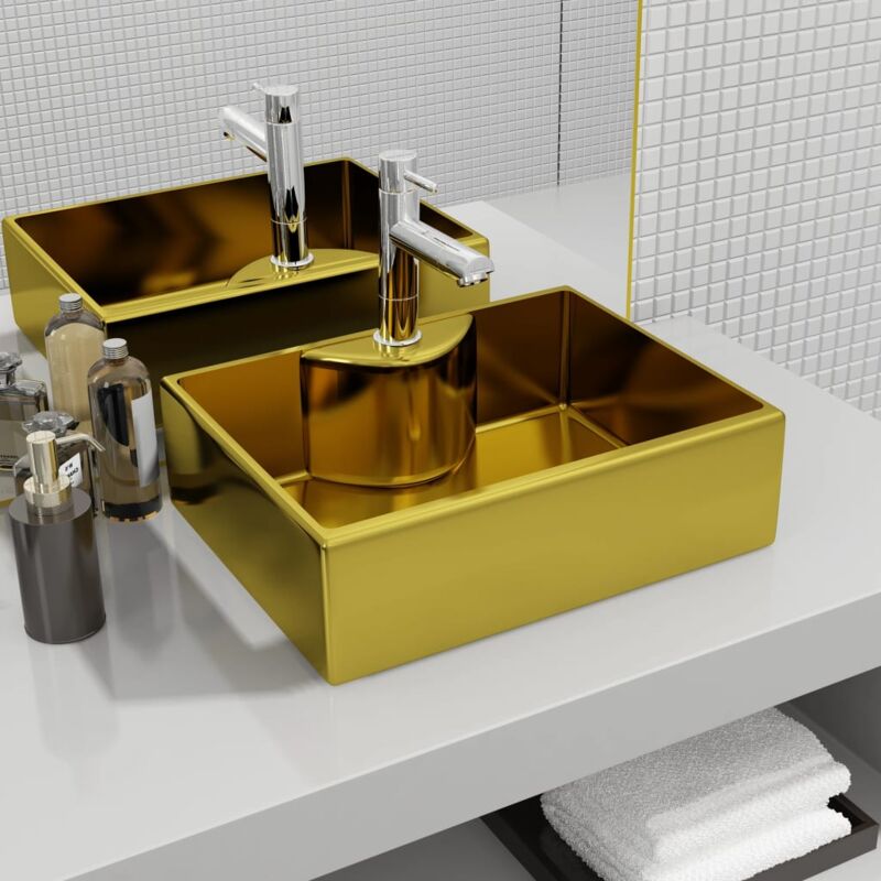 Descrizione: Realizzato in ceramica, questo lavabo costituisce un'aggiunta elegante e senza tempo a qualsiasi stanza da bagno, toilette, guardaroba o lavatoio. Questo lavabo non solo è pratico nell'uso quotidiano, ma costituisce anche un elemento decorativo in qualsiasi ambiente. Grazie al suo design di tendenza e contemporaneo, caratterizzato da un colore oro brillante, il lavabo si adatta alla perfezione a qualsiasi stile di arredamento. Realizzato in ceramica, il lavello è molto facile da pulire. La finitura lucida fornisce al prodotto un ulteriore tocco di stile. Il lavello è dotato di un foro per l'installazione di un rubinetto. Si prega di notare che il rubinetto e lo scarico non sono inclusi nella fornitura. Specificazioni: Colore: Oro Materiale: Ceramica Dimensioni: 48 x 37 x 13,5 cm (L x P x A) Diametro del foro di scarico: 4,5 cm Foro per il rubinetto: 3,5 cm Tipo di installazione: Su piano di appoggio Con foro per rubinetto