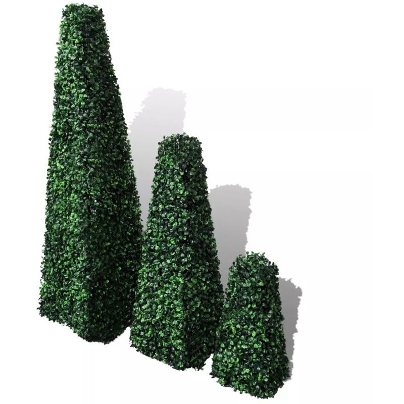 Descrizione: Questo set di 3 piramidi topiarie in bosso artificiale è adatto per essere usato sia all'interno che all'aperto. Con le sue foglie lussureggianti in verde misto e testura naturale, il nostro set topiario ha un aspetto autentico e bello. Aggiungerà bellezza ai tuoi ambienti interni o esterni.Realizzato in plastica di alta qualità, il set di bosso artificiale è resistente agli agenti climatici e durevole. Le nostre piante artificiali di aqualità hanno base di plastica, pe aggiungere stabilità.La consegna include 3 pezzi di 3 dimensioni diverse. Specificazioni: Colore: verde misto Piramide grande: 30 x 30 x 100 cm (L x P x A) Piramide media: 25 x 25 x 65 cm (L x P x A) Piramide piccola: 15 x 15 x 35 cm (L x P x A) Adatto sia per uso interno che esterno La fornitura comprende 3 pezzi Materiale: Polietilene: 100%