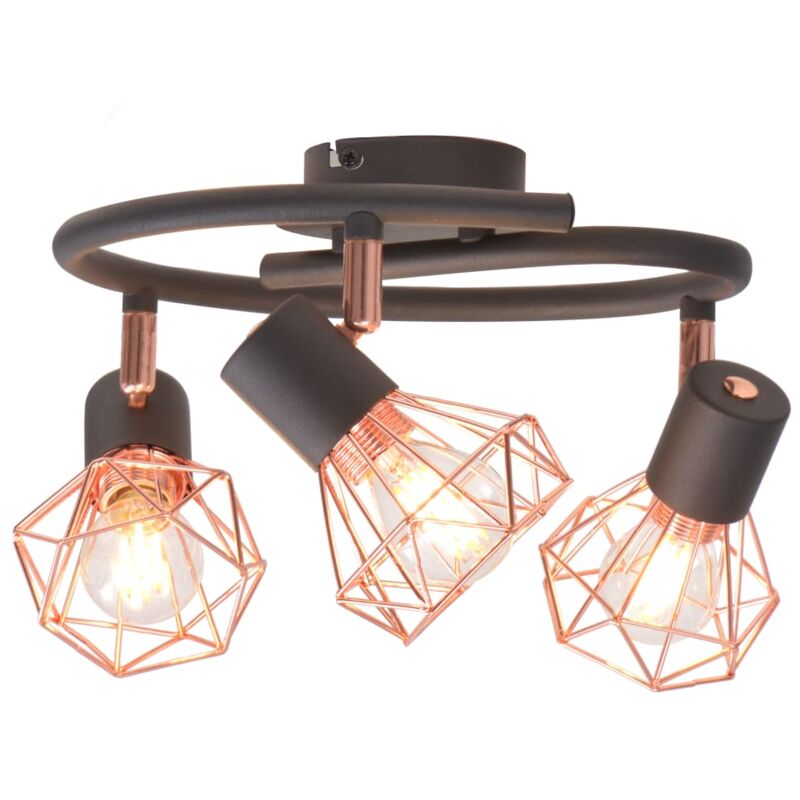 Descrizione: Questa plafoniera con 3 faretti ha un design industriale e migliorerà l'aspetto di qualsiasi stanza. La lampada può essere facilmente montata a parete o soffitto grazie alla base in metallo nero di alta qualità. Gli originali paralumi dei faretti in fili di ferro color rame si aggiungono allo stile industriale e creano un piacevole effetto mentre la luce emessa illumina ogni angolo della stanza. Il lampadario è adatto per lampadine E14, ma si prega di notare che le lampadine non sono incluse nella consegna. Specificazioni: Colore: Nero e ramato Materiale: Struttura in metallo + paralume in filo di ferro Dimensione della base: 8 x 2,5 cm (Diametro x A) Diametro del paralume: 9 cm Diametro del cerchio della guida: 25 cm Alimentazione: 230 V~, 50 Hz Potenza: Massimo 3 da 40 W Tipo di attacco: E14 Nota: Le lampadine non sono incluse