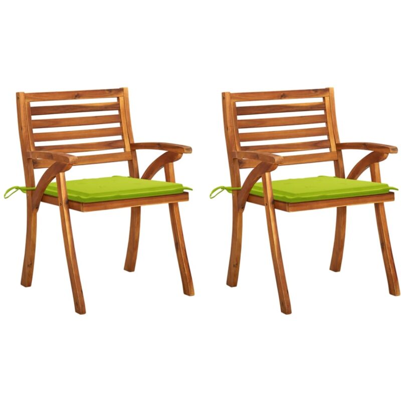 Sedetevi per una bella cena all'aperto o semplicemente rilassatevi e godetevi il bel tempo con queste sedie da pranzo in legno massello di acacia. Queste sedie da pranzo sono realizzate in legno massello di acacia, un materiale che le rende robuste e resistenti. I cuscini aggiungono ulteriore comfort. Ogni cuscino è dotato di due serie di corde che ne agevolano il fissaggio sicuro alle sedie in legno. Colore dei cuscini: Verde brillante Materiale della sedia: Legno massello di acacia con finitura ad olio Materiale del cuscino: Tessuto (100% poliestere) Dimensioni complessive della sedia: 59 x 59 x 87 cm (L x P x A) Dimensioni del cuscino: 50 x 50 x 3 cm (L x P x A) Assemblaggio richiesto: Sì La consegna include: 2 Sedie da pranzo 2 Cuscini