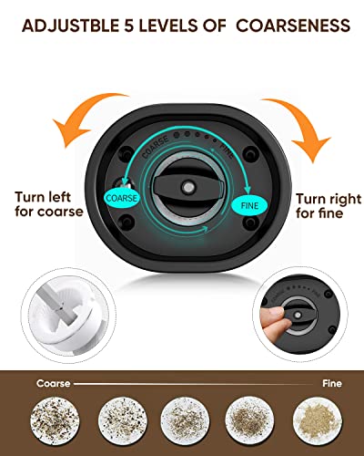 【Grossità regolabile in 5 livelli】 Il macinapepe elettrico ha 5 livelli di macinatura tra cui scegliere, spezie da grossolane a fini. Puoi scegliere la ruvidità della tua spezia, sale o pepe ruotando la manopola di regolazione sul fondo del macinino.
