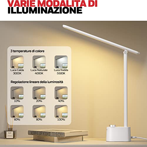 【Lampada da scrivania dimmerabile per l'home office】-- controlla facilmente 3 temperature di colore (luce calda 3000K, luce naturale 4000K, luce fredda 5500K) con un interruttore a pulsante per personalizzare la tua esperienza di illuminazione e soddisfare le esigenze dei diversi cambi di scena. Il pulsante rotante sulla moderna lampada da comodino può ottenere una regolazione della luminosità del 15% -100%, perfetta per scenari di design, artigianato, lavoro raffinato, disegno o relax.