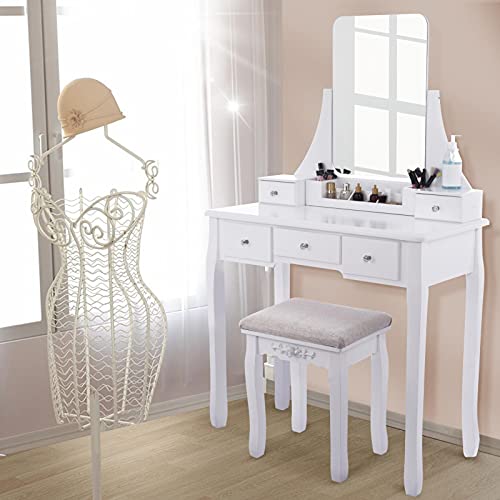 Honganrunli Tavolo da toeletta con Grande Specchio, in Legno, 137,5 x 80 x 40 cm, Lussuoso Tavolo da toeletta con Protezione antiribaltamento, 5 cassetti/Pouf Lussuoso, per Camera da Letto, Bianco