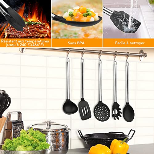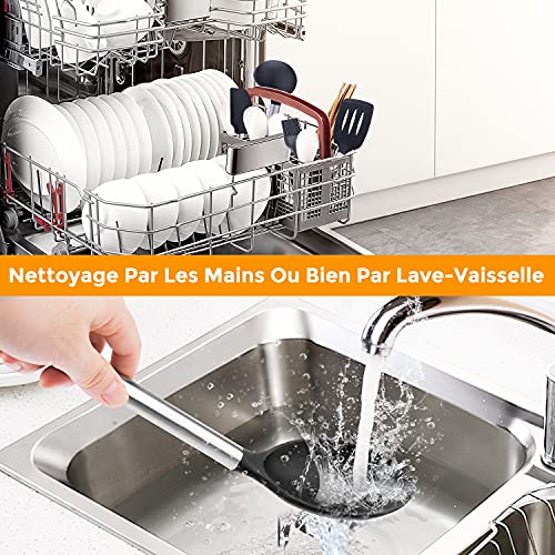 【Facile da riporre e pulire】 Ogni utensile di questo set da cucina ha un foro nel manico, e vi forniamo 10 ganci per consentire un'asciugatura naturale dopo il lavaggio e per evitare che i batteri crescano nel secchio di stoccaggio. Il silicone del nostro prodotto è antiaderente, quindi sarà facile da pulire e risparmiare il vostro tempo dopo un pasto.