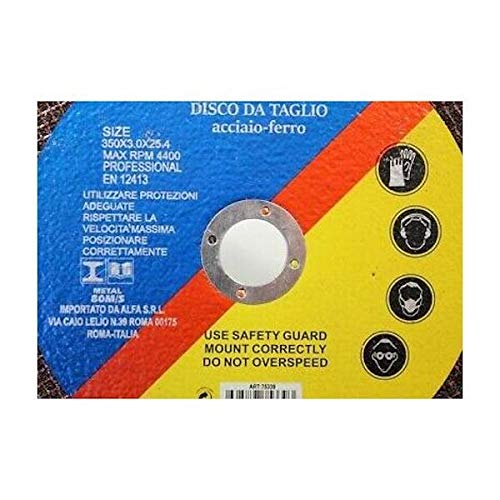 Caratteristiche Tecniche Diametro 350mm Spessore 3mm Diametro foro 25,4mm Max RPM 4000 Velocità massima di impiego 80M/sec. EN 12413