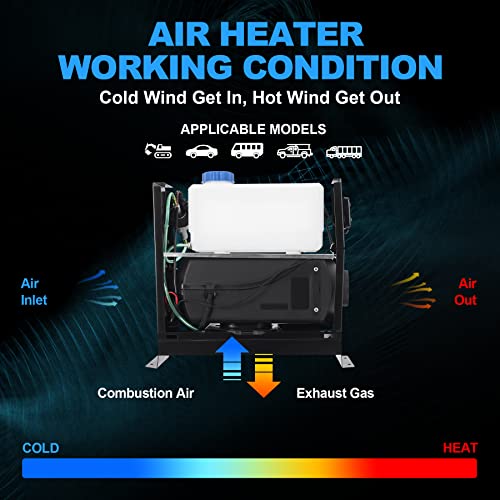 ➤ Basso rumore: riscaldatore diesel con un silenziatore, basso rumore, può funzionare senza intoppi in qualsiasi ambiente, fare una notte tranquilla per voi. La serie completa di accessori permette di installare facilmente il riscaldatore di parcheggio nel veicolo. Può essere installato in modo flessibile sotto la cabina, il bagagliaio o il contenitore.
